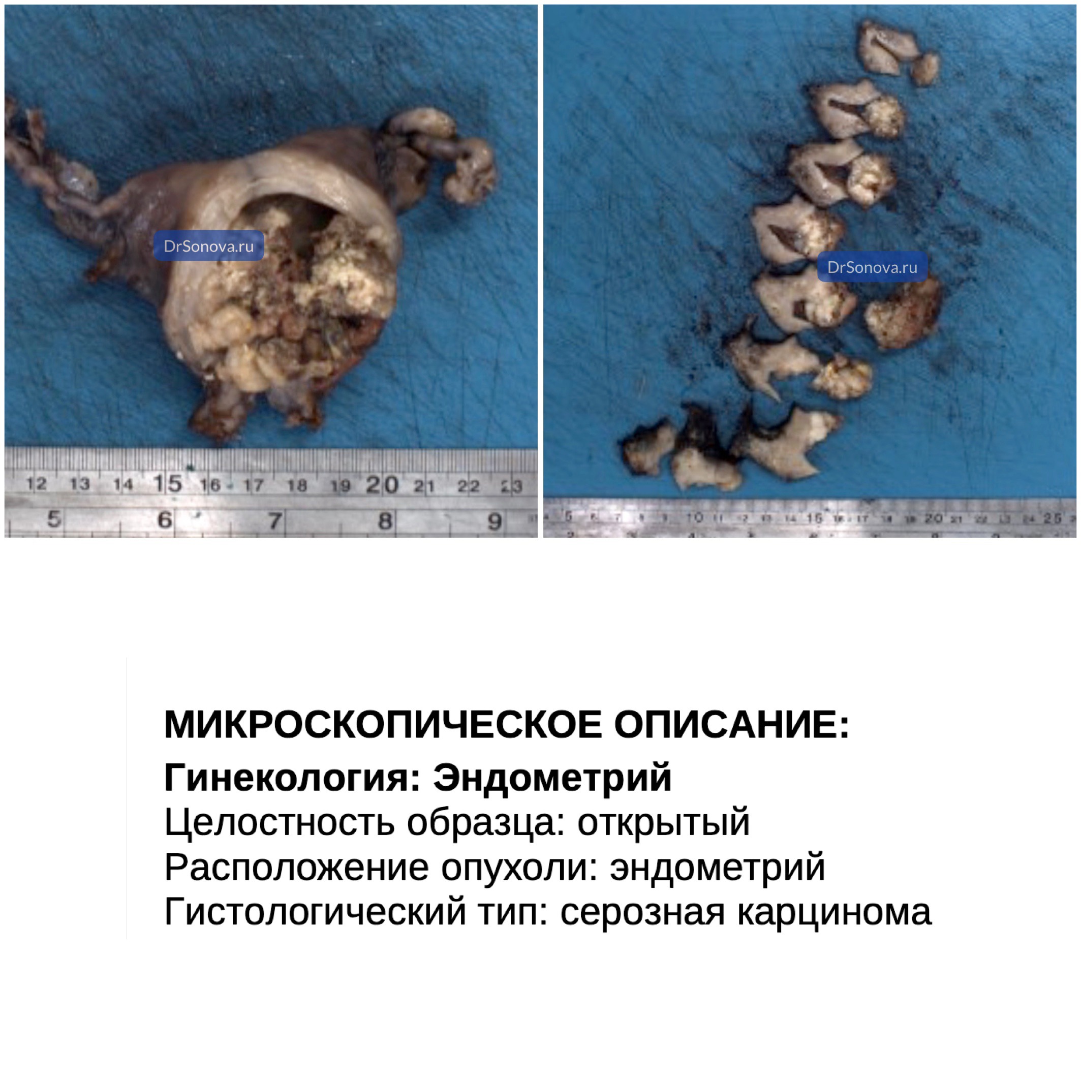 Онкологическим консилиумом было принято решение о проведении гистерэктомии лапароскопическим доступом. Выполнена радикальная гистерэктомия c биопсией очагов канцероматоза и сальника. По результатам гистологического исследования выявлен серозный раз яичников (т.е. РЭ 2 типа). Причем только последоперационное стадирование смогло явить нам истинную запущенность заболевания - в реальности у пациентки оказалась 3-я стадия, а не 1-ая!