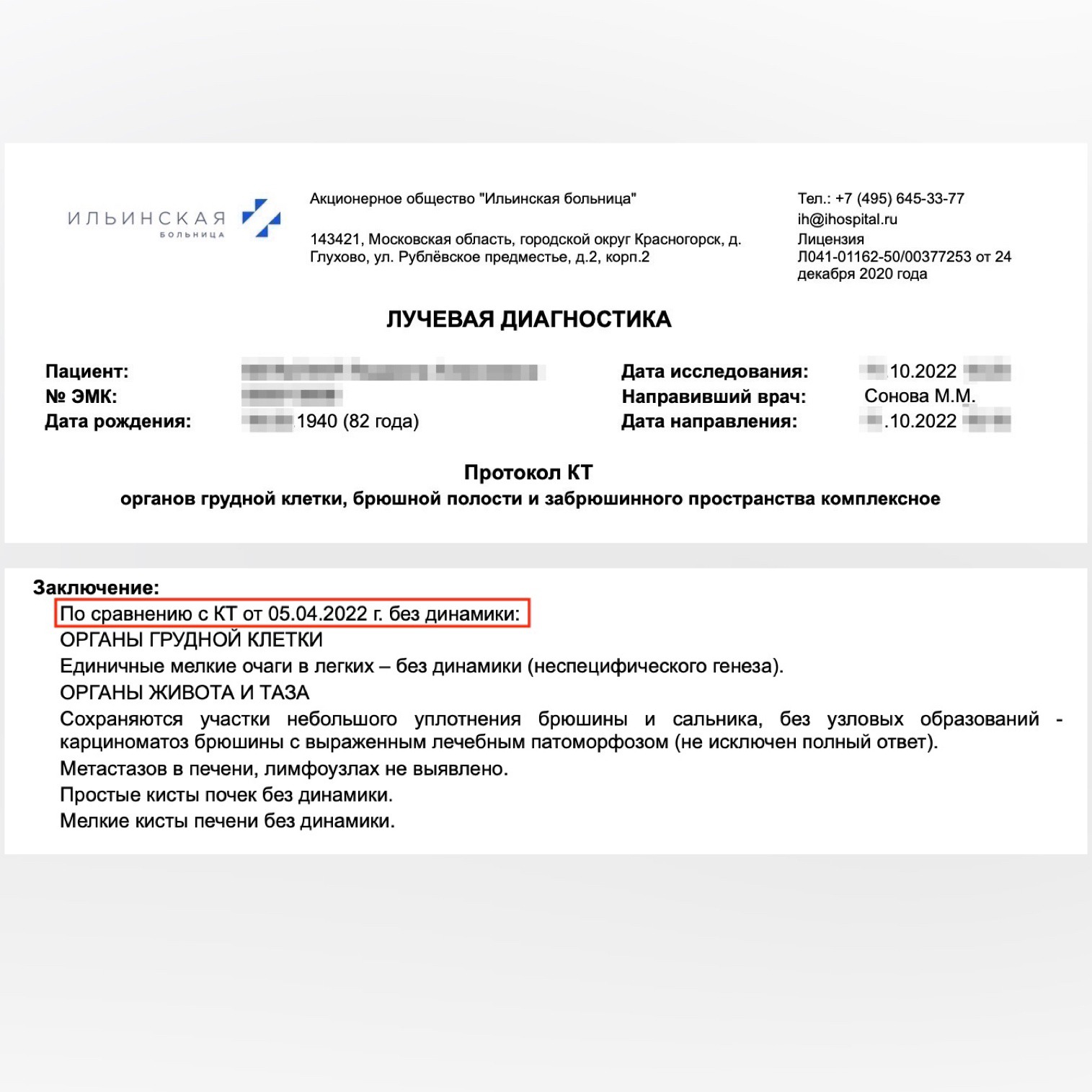 На динамическом наблюдении в Ильинской больнице находится пациентка Л. 82 лет. Впервые она обратилась к нам в 2020г. с жалобами на интенсивные боли в нижних отделах и увеличение живота.